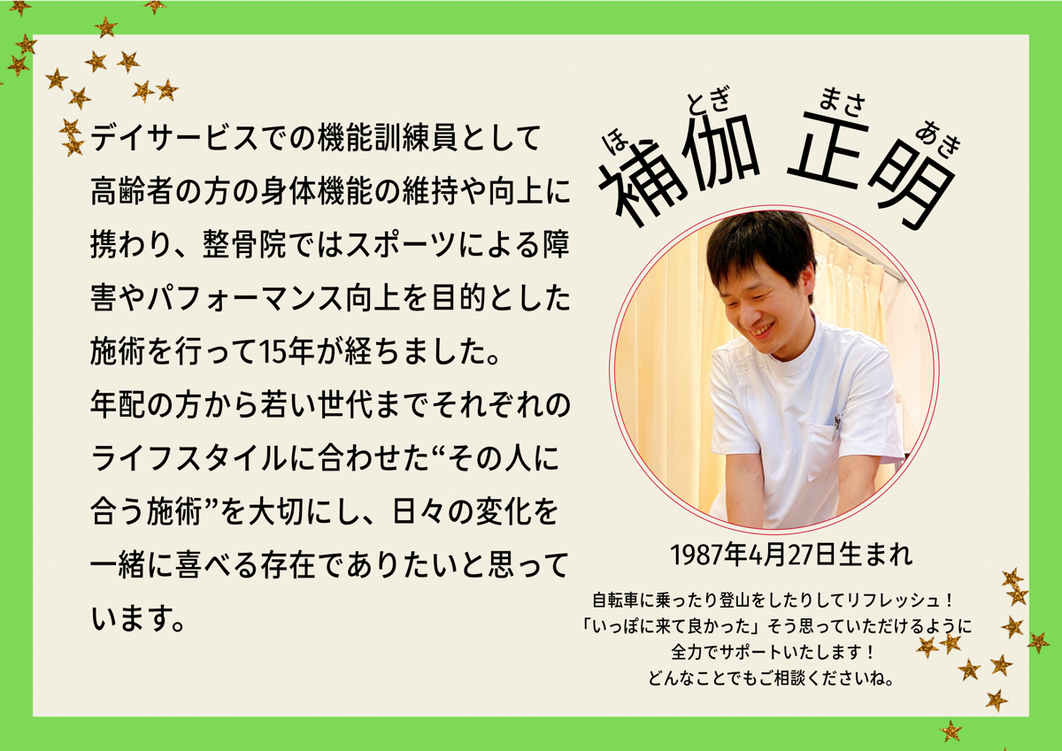 肩こり、腰痛、首、足、腕の痛み、背骨のゆがみ、交通事故、ムチウチ、ギックリ腰、スポーツ障害、保険治療、リハビリ、眼精疲労